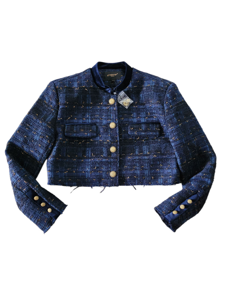 Blaue, kurze Jacke von Attentif Paris in Gr.38 mit goldenen Fäden und Knöpfen, Polyester, Neu
